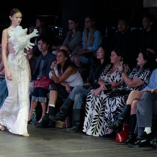 Auch unsere Partner der TU Chemnitz – Johannes, Andre und Ricarda – waren bei der Show dabei und haben während der einjährigen Vorbereitung an der Bekleidungskollektion mitgewirkt, vor allem in den Bereichen technischer Support, 3D-Druck und Accessoires aus 3D-Druck von Keramik. Kolleginnen und Kollegen des Instituts für Leichtbaustrukturen erkundeten zudem die Möglichkeiten der Verbindung von Textilien mit 3D-Druck im Sinne der Entwicklung von Faserverbundwerkstoffen.